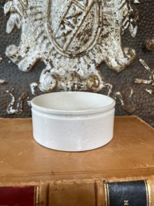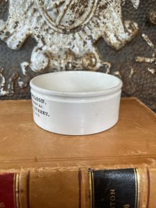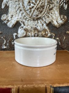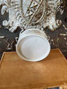 These are authentic antique advertising pots sourced during my recent buying trip to England. I have been sourcing these wonderful antique pots for over 12 years from friends who are actually digging them up in ancient rubbish sites all over England. I purchased my first antique Advertising pot when my husband and I had the wonderful opportunity to live in England in the 1980’s. Our daughter was born there and we enjoyed living in England so much we often went back to visit after returning to the US.