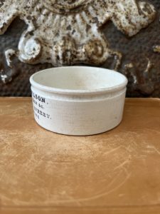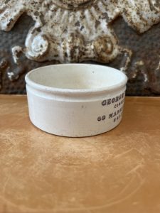 These are authentic antique advertising pots sourced during my recent buying trip to England. I have been sourcing these wonderful antique pots for over 12 years from friends who are actually digging them up in ancient rubbish sites all over England. I purchased my first antique Advertising pot when my husband and I had the wonderful opportunity to live in England in the 1980’s. Our daughter was born there and we enjoyed living in England so much we often went back to visit after returning to the US.