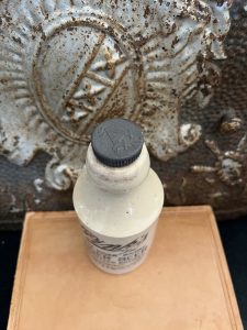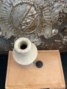 This is an authentic antique advertising pot sourced during my recent buying trip to England. I have been sourcing these wonderful antique pots for over 12 years from sources who are actually digging them up in ancient rubbish sites all over England. I purchased my first antique Advertising pot when my husband and I had the wonderful opportunity to live in England in the 1980’s. Our daughter was born there and we enjoyed living in England so much we often went back to visit after returning to the US.