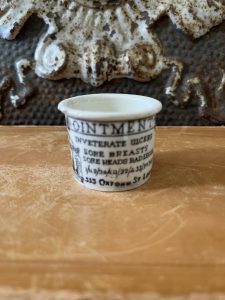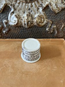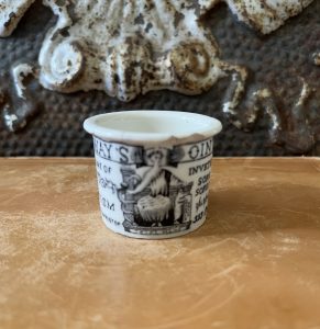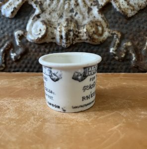 This is an authentic antique advertising pot sourced during my recent buying trip to England. I have been sourcing these wonderful antique pots for over 12 years from sources who are actually digging them up in ancient rubbish sites all over England. I purchased my first antique Advertising pot when my husband and I had the wonderful opportunity to live in England in the 1980’s. Our daughter was born there and we enjoyed living in England so much we often went back to visit after returning to the US.