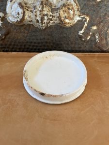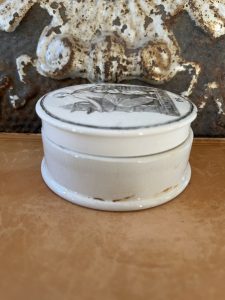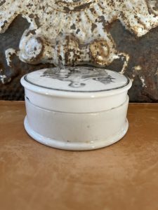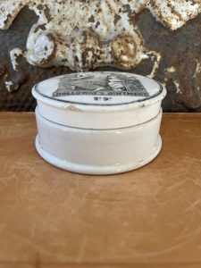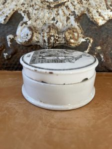 This is an authentic antique advertising pots sourced during my recent buying trip to England. I have been sourcing these wonderful antique pots for over 12 years from friends who are actually digging them up in ancient rubbish sites all over England. I purchased my first antique Advertising pot when my husband and I had the wonderful opportunity to live in England in the 1980’s. Our daughter was born there and we enjoyed living in England so much we often went back to visit after returning to the US.