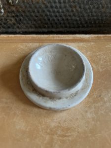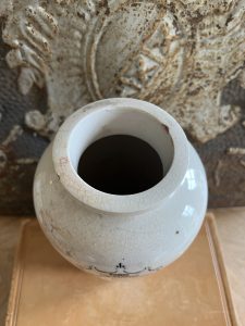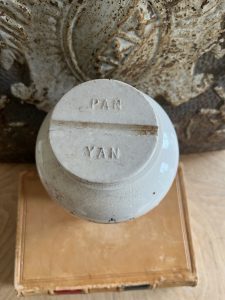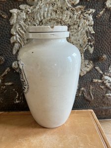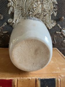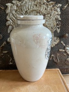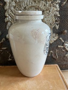 This is an authentic antique advertising pot sourced during my recent buying trip to England. I have been sourcing these wonderful antique pots for over 12 years from sources who are actually digging them up in ancient rubbish sites all over England. I purchased my first antique Advertising pot when my husband and I had the wonderful opportunity to live in England in the 1980’s. Our daughter was born there and we enjoyed living in England so much we often went back to visit after returning to the US.