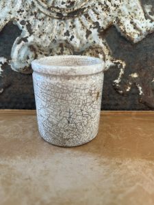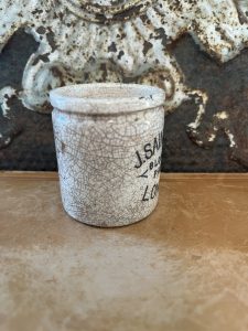 This is an authentic antique advertising pot sourced during my recent buying trip to England. I have been sourcing these wonderful antique pots for over 10 years from sources who are actually digging them up in ancient rubbish sites all over England. I purchased my first antique Advertising pot when my husband and I had the wonderful opportunity to live in England in the 1980’s. Our daughter was born there and we enjoyed living in England so much we often went back to visit after returning to the US.