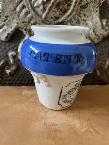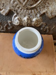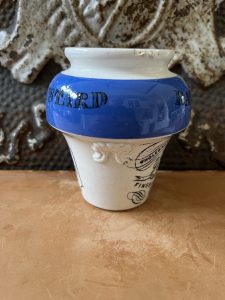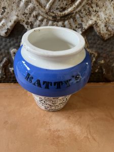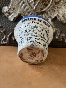 This is an authentic antique advertising pot sourced during my recent buying trip to England. I have been sourcing these wonderful antique pots for over 12 years from sources who are actually digging them up in ancient rubbish sites all over England. I purchased my first antique Advertising pot when my husband and I had the wonderful opportunity to live in England in the 1980’s. Our daughter was born there and we enjoyed living in England so much we often went back to visit after returning to the US.