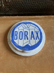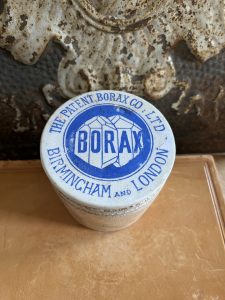 Borax (sodium borate) is a naturally occurring mineral used as a cleaning agent, laundry booster, antiseptic, preservative, and in glassmaking and ceramics. It became popular in Victorian and Edwardian Britain as a household essential, marketed for its versatility in cleaning and preservation.