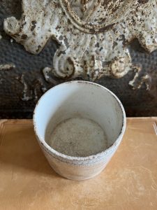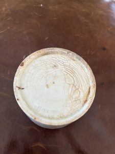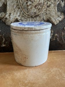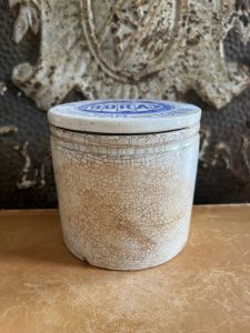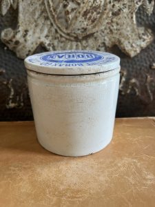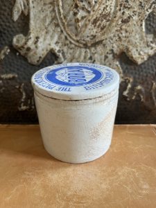 This is an authentic antique advertising pot sourced during my recent buying trip to England. I have been sourcing these wonderful antique pots for over 12 years from friends who are actually digging them up in ancient rubbish sites all over England. I purchased my first antique Advertising pot when my husband and I had the wonderful opportunity to live in England in the 1980’s. Our daughter was born there and we enjoyed living in England so much we often went back to visit after returning to the US.