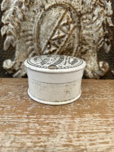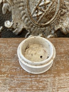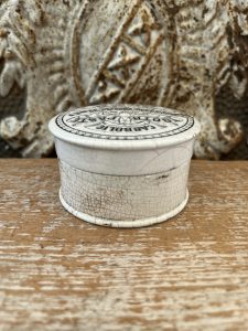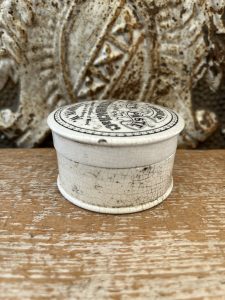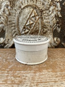 This authentic English antique advertising pot was sourced during my recent buying trip to England. I have been sourcing these wonderful antique pots for over 12 years from sources who are actually digging them up in ancient rubbish sites all over England. I purchased my first antique Advertising pot when my husband and I had the wonderful opportunity to live in England in the 1980’s. Our daughter was born there and we enjoyed living in England so much we often went back to visit after returning to the US.