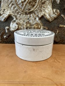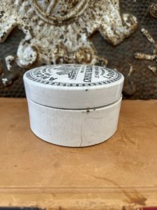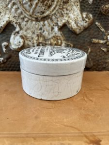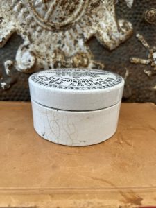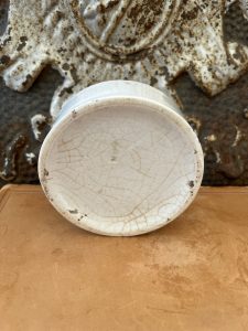 This is an authentic antique advertising pot sourced during my recent buying trip to England. I have been sourcing these wonderful antique pots for over 12 years from friends who are actually digging them up in ancient rubbish sites all over England. I purchased my first antique Advertising pot when my husband and I had the wonderful opportunity to live in England in the 1980’s. Our daughter was born there and we enjoyed living in England so much we often went back to visit after returning to the US.