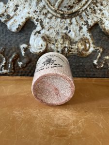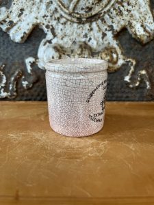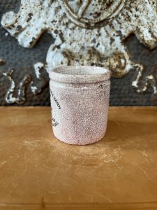 This is an authentic antique English advertising pot sourced during my recent buying trip to England. I have been sourcing these wonderful pots for over 12 years from friends who are actually digging them up in ancient rubbish sites all over England. I purchased my first antique Advertising pot when my husband and I had the wonderful opportunity to live in England in the 1980’s. Our daughter was born there and we enjoyed living in England so much we often went back to visit after returning to the US.