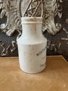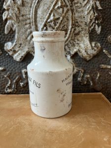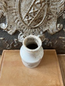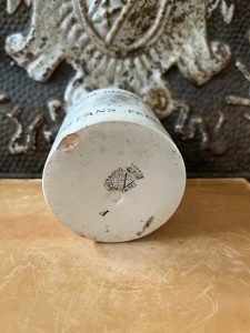 This is an authentic antique advertising pot sourced during my recent buying trip to England. I have been sourcing these wonderful antique pots for over 12 years from sources who are actually digging them up in ancient rubbish sites all over England. I purchased my first antique Advertising pot when my husband and I had the wonderful opportunity to live in England in the 1980’s. Our daughter was born there and we enjoyed living in England so much we often went back to visit after returning to the US.