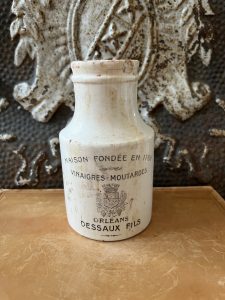 Very rare Authentic antique French stoneware mustard pot from Orléans, France, produced for the historic firm Dessaux Fils, a renowned maker of vinegar and mustard founded in 1789.