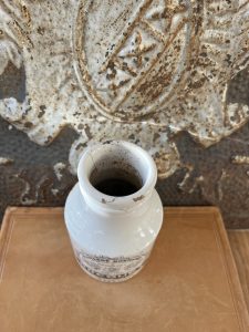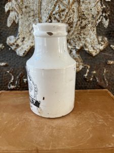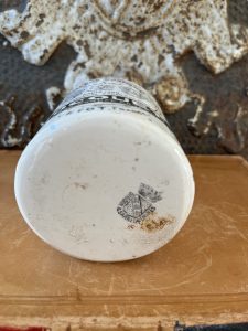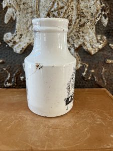 This is an authentic antique advertising pot sourced during my recent buying trip to England. I have been sourcing these wonderful antique pots for over 12 years from sources who are actually digging them up in ancient rubbish sites all over England. I purchased my first antique Advertising pot when my husband and I had the wonderful opportunity to live in England in the 1980’s. Our daughter was born there and we enjoyed living in England so much we often went back to visit after returning to the US.