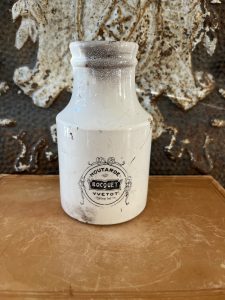 Antique French Crazed Ironstone 2-Sided Bocquet Moutarde Normande- Yvette, France c. 1900. A glazed stoneware “pot à moutarde” (mustard pot), used for retail sale of prepared mustard. These jars were meant to be reused in the kitchen after the mustard was gone. Bocquet was a long-established mustard maker in Yvetot (Seine-Inférieure, now Seine-Maritime), Normandy.