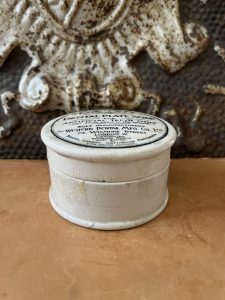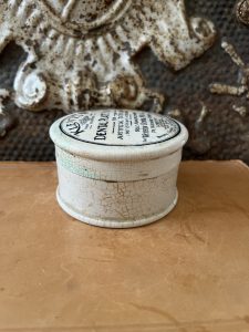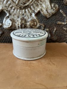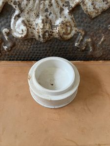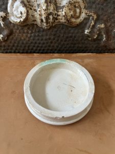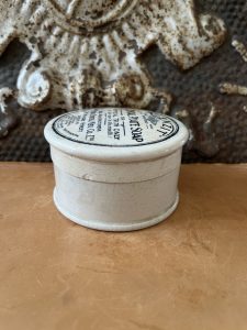 This is an authentic antique advertising pot sourced during my recent buying trip to England. I have been sourcing these wonderful antique pots for over 12 years from friends who are actually digging them up in ancient rubbish sites all over England. I purchased my first antique Advertising pot when my husband and I had the wonderful opportunity to live in England in the 1980’s. Our daughter was born there and we enjoyed living in England so much we often went back to visit after returning to the US.