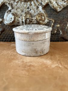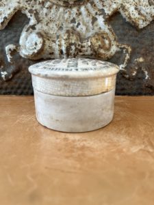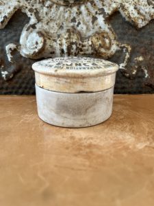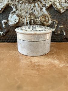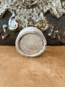 This is an authentic antique advertising pot sourced during my recent buying trip to England. I have been sourcing these wonderful antique pots for over 12 years from sources who are actually digging them up in ancient rubbish sites all over England. I purchased my first antique Advertising pot when my husband and I had the wonderful opportunity to live in England in the 1980’s. Our daughter was born there and we enjoyed living in England so much we often went back to visit after returning to the US.