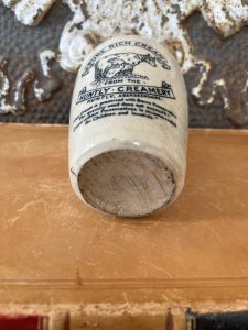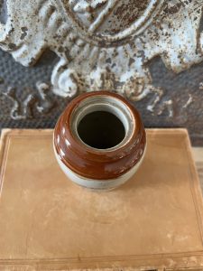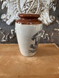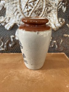 This is an authentic antique advertising pot sourced during my recent buying trip to England. I have been sourcing these wonderful antique pots for over 12 years from friends who are actually digging them up in ancient rubbish sites all over England. I purchased my first antique Advertising pot when my husband and I had the wonderful opportunity to live in England in the 1980’s. Our daughter was born there and we enjoyed living in England so much we often went back to visit after returning to the US.