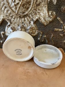 This is an authentic antique English advertising pot sourced during my recent buying trip to England. I have been sourcing these wonderful pots for over 12 years from friends who are actually digging them up in ancient rubbish sites all over England. I purchased my first antique Advertising pot when my husband and I had the wonderful opportunity to live in England in the 1980’s. Our daughter was born there and we enjoyed living in England so much we often went back to visit after returning to the US.