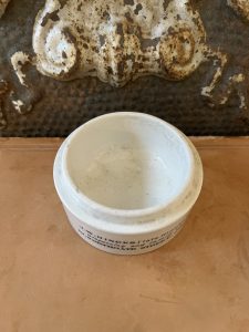 This is an authentic antique English advertising pot sourced during my recent buying trip to England. I have been sourcing these wonderful pots for over 12 years from friends who are actually digging them up in ancient rubbish sites all over England. I purchased my first antique Advertising pot when my husband and I had the wonderful opportunity to live in England in the 1980’s. Our daughter was born there and we enjoyed living in England so much we often went back to visit after returning to the US.