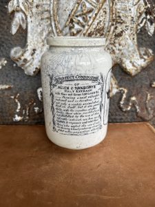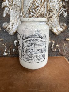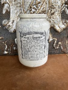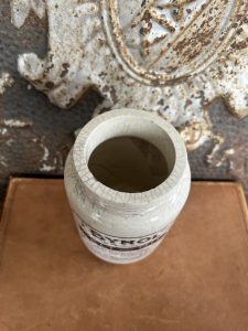 This is an authentic antique advertising pot sourced during my recent buying trip to England. I have been sourcing these wonderful antique pots for over 12 years from sources who are actually digging them up in ancient rubbish sites all over England. I purchased my first antique Advertising pot when my husband and I had the wonderful opportunity to live in England in the 1980’s. Our daughter was born there and we enjoyed living in England so much we often went back to visit after returning to the US.