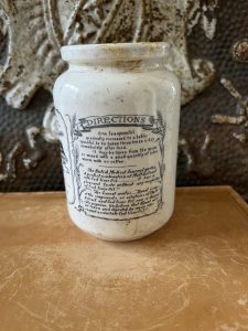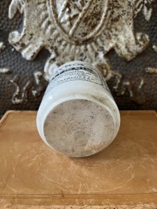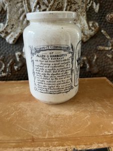 This is an authentic antique advertising pot sourced during my recent buying trip to England. I have been sourcing these wonderful antique pots for over 12 years from sources who are actually digging them up in ancient rubbish sites all over England. I purchased my first antique Advertising pot when my husband and I had the wonderful opportunity to live in England in the 1980’s. Our daughter was born there and we enjoyed living in England so much we often went back to visit after returning to the US.