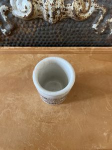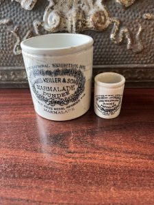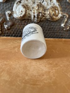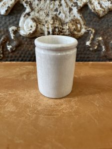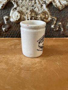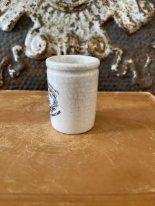 This is an authentic antique advertising pot sourced during my recent buying trip to England. I have been sourcing these wonderful antique pots for over 12 years from sources who are actually digging them up in ancient rubbish sites all over England. I purchased my first antique Advertising pot when my husband and I had the wonderful opportunity to live in England in the 1980’s. Our daughter was born there and we enjoyed living in England so much we often went back to visit after returning to the US.