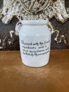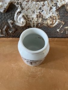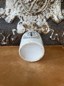 This is an authentic antique advertising pot sourced during my recent buying trip to England. I have been sourcing these wonderful antique pots for over 12 years from sources who are actually digging them up in ancient rubbish sites all over England. I purchased my first antique Advertising pot when my husband and I had the wonderful opportunity to live in England in the 1980’s. Our daughter was born there and we enjoyed living in England so much we often went back to visit after returning to the US.