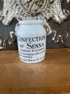 Very Rare Taylor’s Drug Co. Ltd. Confection of Senna advertising pot. The store tagline is “The Popular Drug Stores.” The pot includes a dosage amount on one side and provides a credibility statement on another side that reads: “Prepared with the finest ingredients and in strict accordance with the British Pharmacopoeie.”. Confection of Senna was a traditional medicinal preparation used as a gentle laxative. It typically consisted of senna (a natural herb known for its laxative properties), combined with ingredients like figs, tamarind, or prunes to improve taste and soften its effect—hence the label “lenitive electuary” (a mild, sweet medicinal paste). It was commonly prescribed for constipation and was particularly popular in the 19th and early 20th centuries.