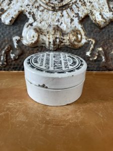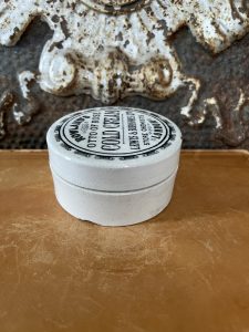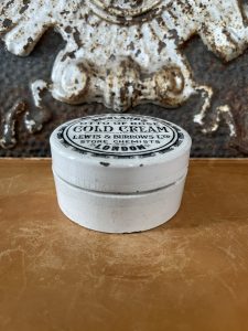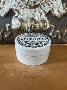 This is a listing for one (1) Rowland’s Otto of Rose Cold Cream, Lewis & Burrows Ltd Store Chemists, London, Lidded Pot w/ Base. Otto of Rose refers to a skincare product infused with rose oil (otto of rose), which was a popular luxury ingredient in the 19th century.