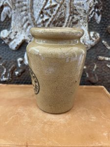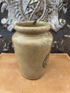 This is an authentic antique advertising pot sourced during my recent buying trip to England. I have been sourcing these wonderful antique pots for over 12 years from friends who are actually digging them up in ancient rubbish sites all over England. I purchased my first antique Advertising pot when my husband and I had the wonderful opportunity to live in England in the 1980’s. Our daughter was born there and we enjoyed living in England so much we often went back to visit after returning to the US.