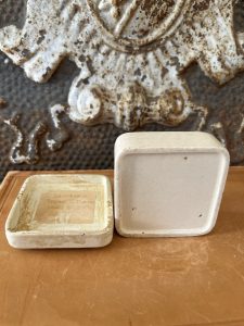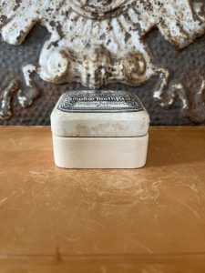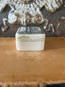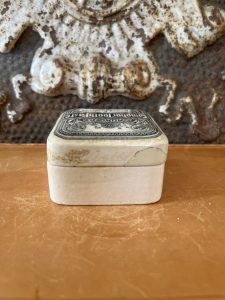 This is an authentic antique advertising pot sourced during my recent buying trip to England. I have been sourcing these wonderful antique pots for over 12 years from friends who are actually digging them up in ancient rubbish sites all over England. I purchased my first antique Advertising pot when my husband and I had the wonderful opportunity to live in England in the 1980’s. Our daughter was born there and we enjoyed living in England so much we often went back to visit after returning to the US.