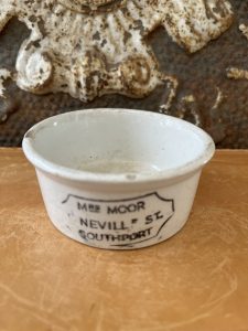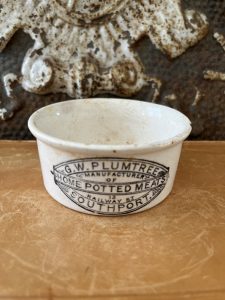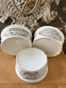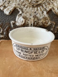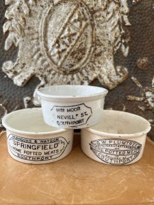 Offering this set of three chippy antique potted meats. Included is one Springfield – Home Potted Meats / Plumtree Home Potted Meats and Mrs Moor for