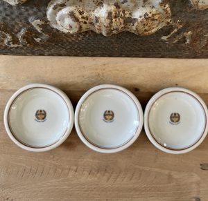 Offering these chunky white hotel ironstone butter pats stamped with “ROYAL Superior Quality” trademark. These old hotel pats are hard to find and heavily sought after. All 3 are in very good condition w/ the red and green rim circles and center trademark seal remaining strong.
