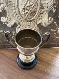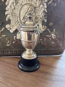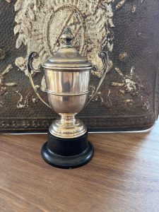 Offered is this very attractive Vintage silver plated trophy with black plastic base and dome top lid. There is no writing on the trophy.