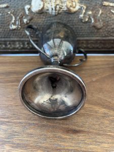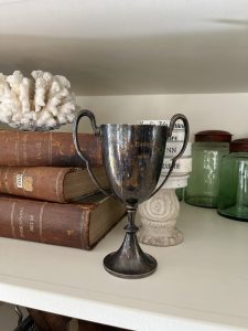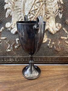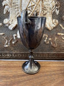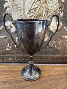 Offered is this very attractive Vintage silver plated English trophy w/ handles. It has a great old England color to it. I picked this up at one of the many markets I visited on our last buying trip to England, and it has that great vinatage feel to compliment your collection.