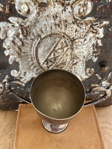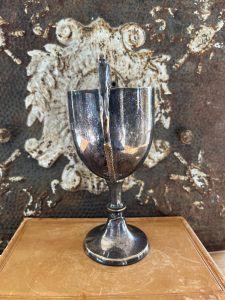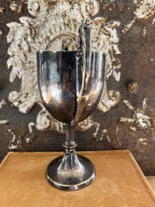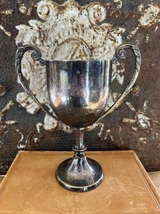 Offered is this very attractive Vintage silver plated English trophy w/ ornate handles. It has a great old England color to it. I picked this up at one of the many markets I visited on our last buying trip to England, and it has that great vinatage feel to compliment your collection.
