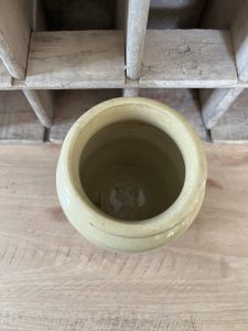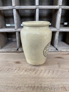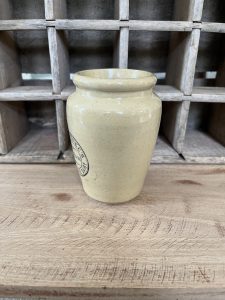 This is an authentic antique advertising pot sourced during my recent buying trip to England. I have been sourcing these wonderful antique pots for over 12 years from friends who are actually digging them up in ancient rubbish sites all over England. I purchased my first antique Advertising pot when my husband and I had the wonderful opportunity to live in England in the 1980’s. Our daughter was born there and we enjoyed living in England so much we often went back to visit after returning to the US.