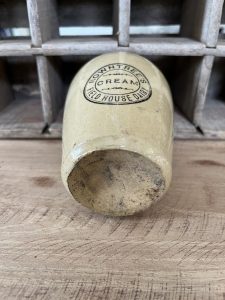 Offering this unique shaped vintage stoneware cream jar from Rowntree’s Field House Dairy. Rowntree’s was located in North Yorkshire, England.