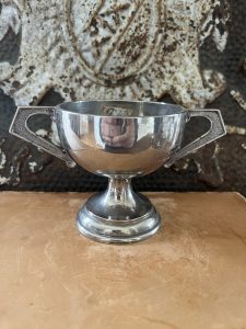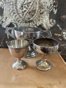 Offered is this great cluster of small silver plated vintage trophies, sold as a set. The tall one is dated 1974, and there is no writing on the other two.