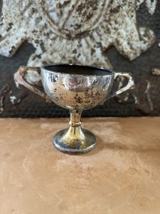 Good condition with age flaking, measures 2 1/2” tall x 3 3/4” handle to handle x 2” mouth